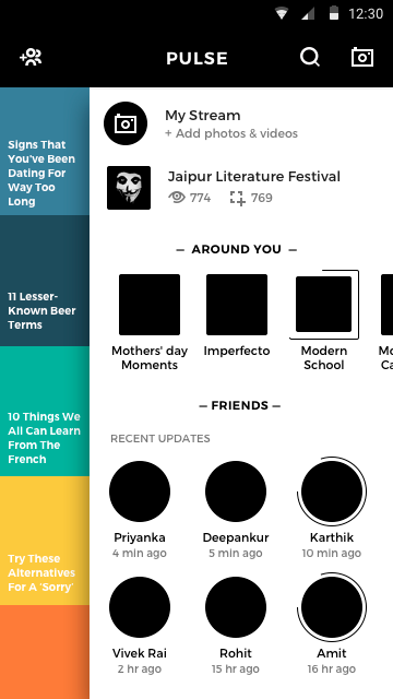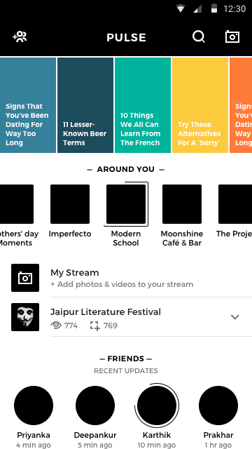 Pulse provides users a full-screen visual experience of streams of colleges around them, with customised stickers to make the experience more fun and engaging. A platform that provides young users relevant content in the form of full-screen multimedia rich stories, which is something they understand the best